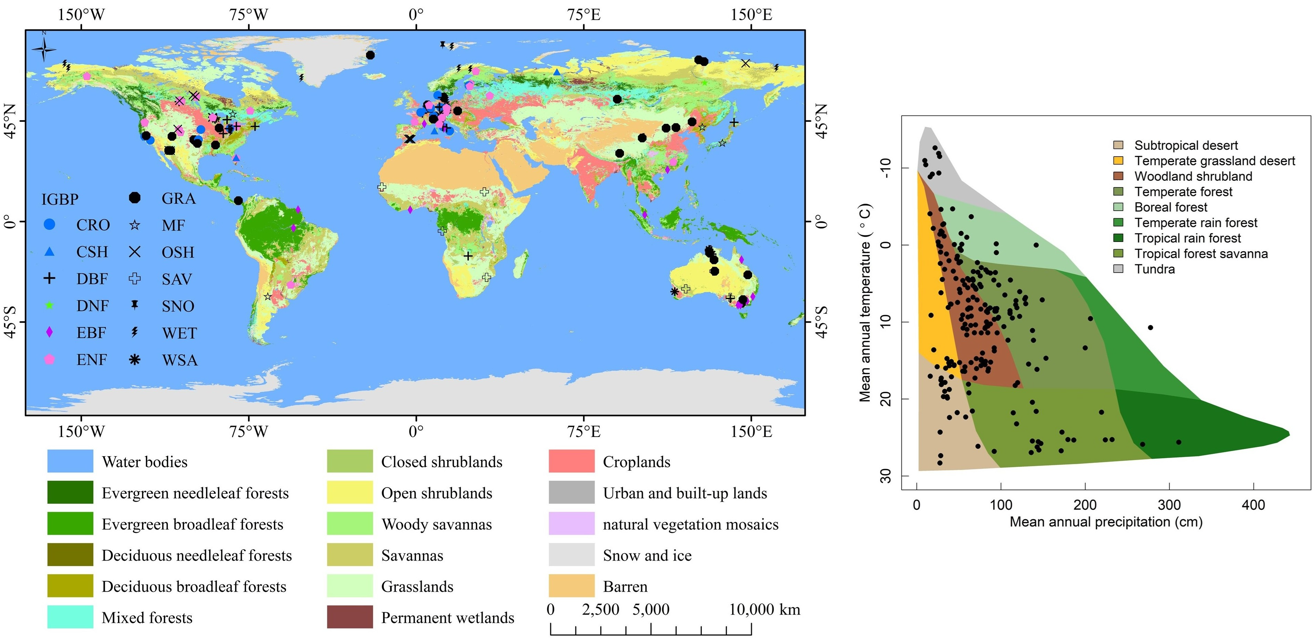 图2 研究使用的120个FLUXNET站点的空间分布及其在Whittaker气候生物群落空间中的位置