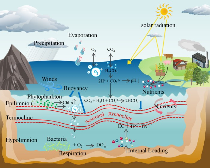 图1.湖泊生态系统中热分层结构及其生物地球化学过程作用机制图