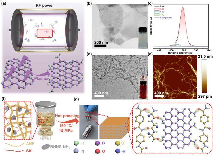 图1. (a) BNNS表面接枝氨基基团过程的示意图。(b) BNNS的TEM图像(插图:BNNS悬浮液的数字图像)。(c) BNNS-NH2的XPS图谱分析。(d) ANF的TEM图像(插图:ANF悬浮液的数字图像)。(e) ANF的AFM图像。(f) 通过真空辅助过滤制备ANF/SK/BNNS-NH2复合薄膜的示意图。(g) ANF/SK/BNNS-NH2复合薄膜微观结构示意图。