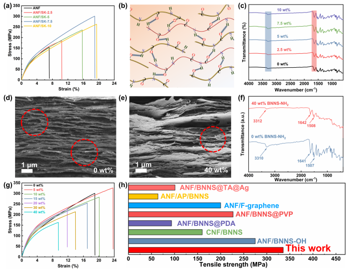 图2. ANF/SK及ANF/SK/BNNS-NH2复合薄膜的力学性能与微观结构。(a) 不同SK浓度下ANF/SK薄膜的应力-应变曲线。(b) ANF与SK间氢键相互作用示意图。(c) 不同SK浓度ANF/SK薄膜的FT-IR光谱。(d) 不同BNNS-NH2浓度复合薄膜的应力-应变曲线。(e) 纯ANF薄膜与(f) 40 wt% BNNS-NH2含量ANF/SK/BNNS-NH2复合薄膜的截面SEM图像。(g) 含0 wt%与40 wt% BNNS-NH2浓度的复合薄膜FT-IR光谱。(h) ANF/SK/BNNS-NH2复合膜拉伸强度与文献报道值的对比。