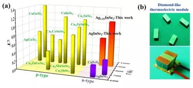 图1.(a)n型AgInSe2类金刚石结构化合物热电优值;(b)首个类金刚石结构化合物热电器件