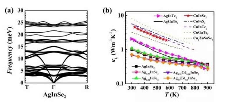 图2.(a)n型AgInSe2类金刚石结构化合物声子谱;(b)晶格热导率