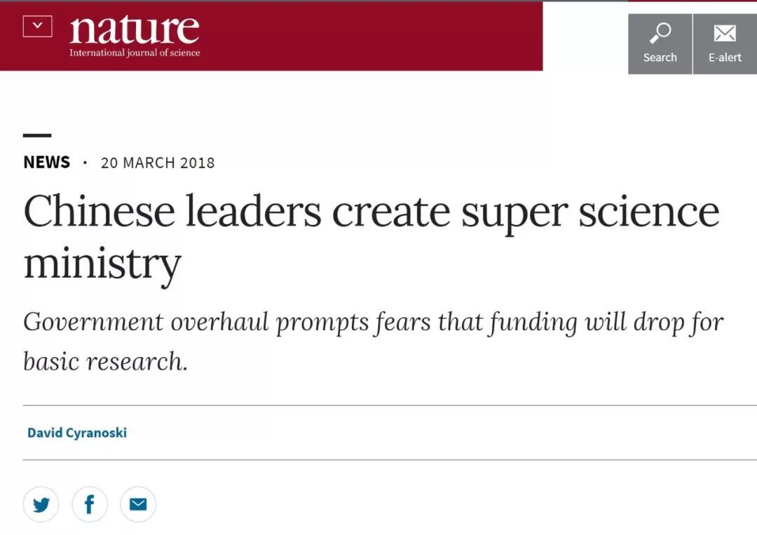 这一消息是在北京全国人大会议上公布的,政府宣布将有超过15个部委和机构合并、重组或撤销。中国国家自然科学基金会(NSFC)将不再由国务院管理,而由国家科技部管理。其他机构的变化包括扩大监督知识产权局的机构,建立一个新的生态环境部门来监测污染并执行环境保护法律,个新的保护机构来帮助保护濒危物种,如普氏原羚羊(Procapra przewalskii)。