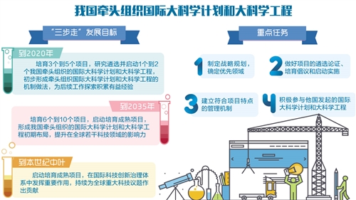 贡献中国智慧,提供全球公共产品,《方案》明确了我国牵头组织国际大科学计划和大科学工程面向2020年、2035年以及本世纪中叶三步走的发展目标:到2020年,培育3个到5个项目,研究遴选并启动1个到2个我国牵头组织的国际大科学计划和大科学工程,初步形成牵头组织国际大科学计划和大科学工程的机制做法,为后续工作探索积累有益经验。到2035年,培育6个到10个项目,启动培育成熟项目,形成我国牵头组织的国际大科学计划和大科学工程初期布局,提升在全球若干科技领域的影响力。到本世纪中叶,培育若干项目,启动培育成熟项目,我国原始科技创新能力显著提高,在国际科技创新治理体系中发挥重要作用,持续为全球重大科技议题作出贡献。