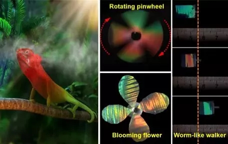 同时,科研人员还模仿了蛇和蚯蚓的运动方式,让这种新型的材料“动起来”。当溶液蒸气和材料本身的厚度满足一定条件时,该材料就能兼具变色和变形两种性能。