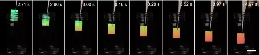 根据这一特点,科研人员制作了一个类似变色龙皮肤纳米结构的薄膜材料,调控该材料在特定溶剂蒸气中暴露的时间长短,就可以实现不同的颜色变化。