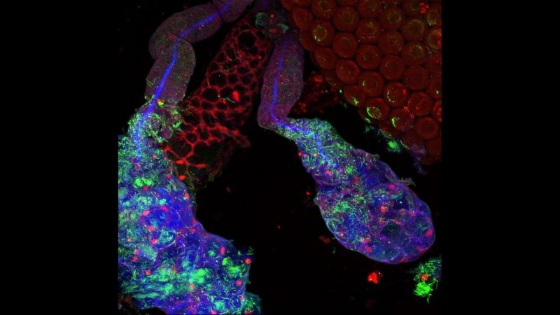 雌性按蚊的唾液腺,绿色表示导致疟疾的寄生虫。