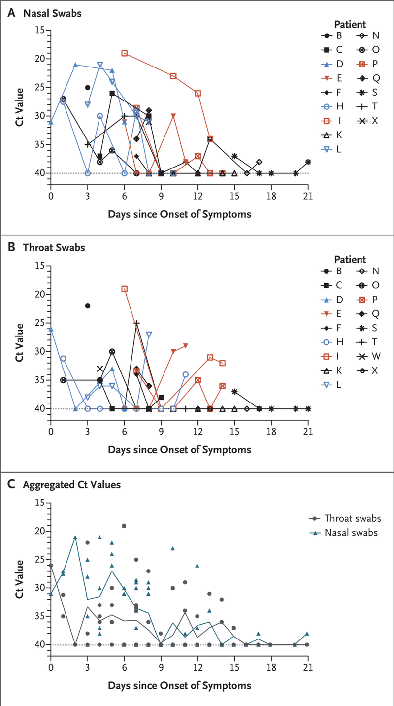图表说明:从感染新冠病毒的患者获得的鼻拭子和咽拭子中检测到的病毒载量。