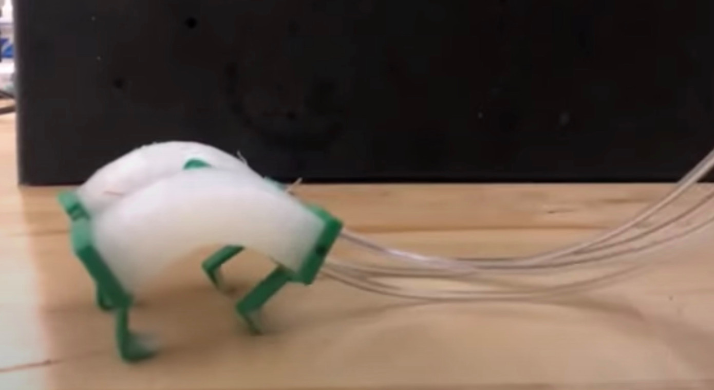“我们受到猎豹的启发,创造了一种具有弹簧动力,双稳态脊柱的软机器人,这意味着该机器人具有两种稳定状态。我们可以通过将空气泵入软硅胶机器人内衬的通道,来实现在两种稳定状态之间的切换。在这两种状态之间切换会释放大量能量,从而使机器人可以快速对地面施加力。这使机器人可以在整个表面奔驰,这也意味着机器人的脚会离开地面。” 尹杰表示。
