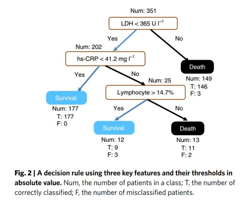 结合这些标志物,论文提出了一个简单且易操作的决策规则,可以快速预测风险最高的新冠肺炎患者,使他们能够被优先考虑,并有可能降低死亡率。