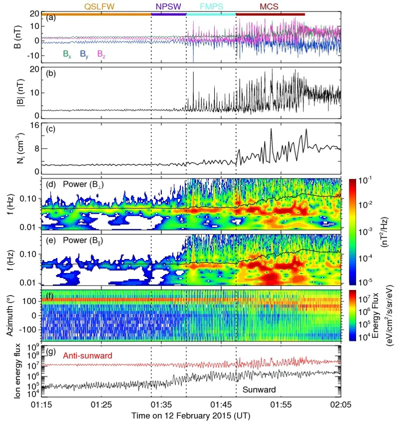 图1.波动演化成周期性激波的完整序列。(a, b) 磁场三分量和总场;(c)离子数密度;(d, e)磁场功率谱;(f)仪器坐标系下离子方位角分布;(g)离子能通量