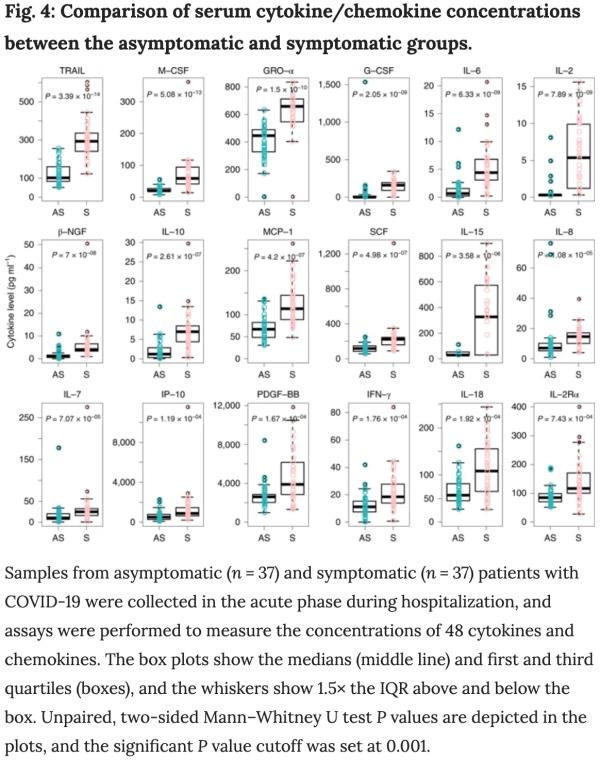 为了进一步阐明与SARS-CoV-2感染相关的免疫反应,研究者比较了无症状组和症状组的血清细胞因子和趋化因子水平。