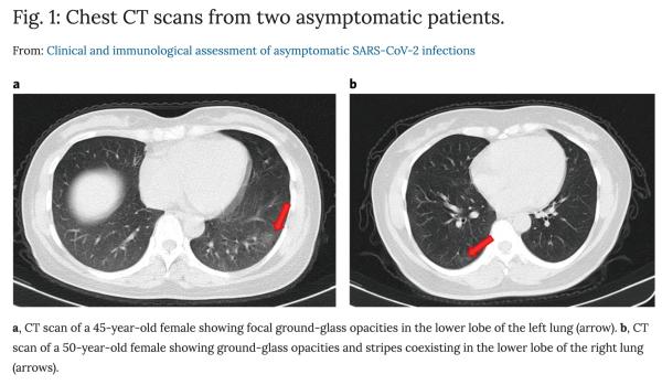 入院时,胸部CT显示11例无症状患者(11/37,29.7%)有局灶毛玻璃影像,10例患者(10/37,27.0%)有条影和/或弥漫性实变,而16例患者(16/37,43.2%)无异常。