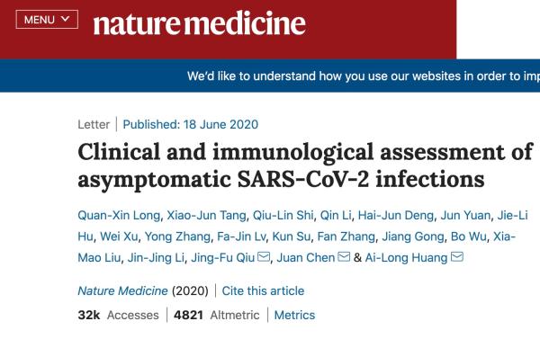 以上结论来自北京时间6月19日刊发于国际权威医学期刊《自然-医学》(Nature Medicine)的研究《对SARS-CoV-2无症状感染者的临床和免疫学评估》(Clinical and immunological assessment of asymptomatic SARS-CoV-2 infections)。研究团队包括重庆医科大学黄爱龙、陈娟、邱景富等。