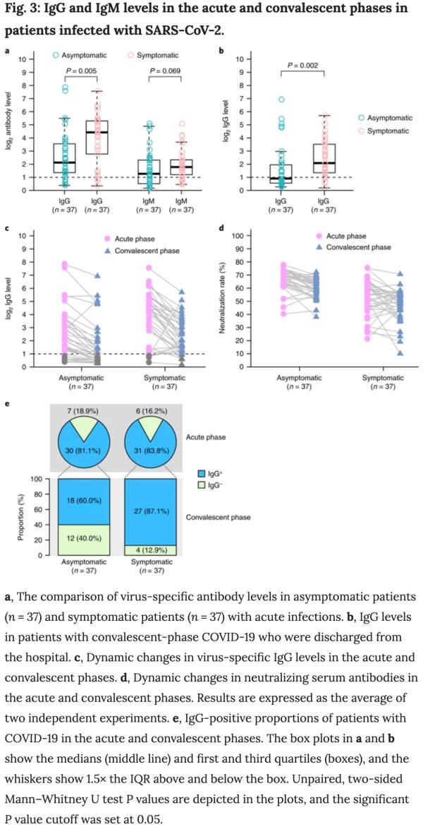 研究者对37名无症状患者和37名有症状患者的早期恢复期(出院8周后)进行了随访。在恢复期早期,症状组IgG水平仍明显高于无症状组(P = 0.002)。令人惊讶的是,无症状组的93.3%(28/30)和症状组的96.8%(30/31)的IgG抗体水平在恢复期早期下降。无症状组IgG抗体水平下降的中位百分比为71.1%(范围32.8-88.8%),而症状组IgG水平下降的中位百分比为76.2%(范围10.9-96.2%)。