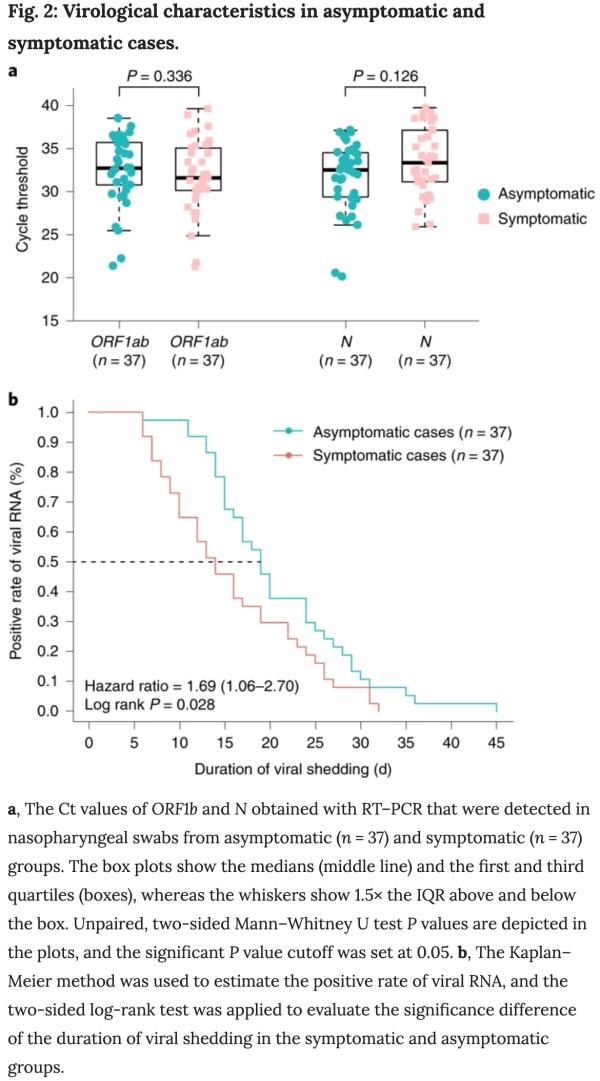 研究者比较了37名无症状患者和37名有症状患者的首个阳性鼻咽拭子的RT-PCR值(Ct)。37例无症状患者和37例有症状的者初始Ct值是相似的:无症状者ORF1b片段Ct值为32.8 (IQR, 30.9-35.8), 有症状者为31.7 (IQR, 30.3-35.1), P = 0.336;无症状者N片段Ct值为32.6 (IQR, 29.5-34.6),有症状者为33.5 (IQR, 31.3-37.2), P = 0.126。