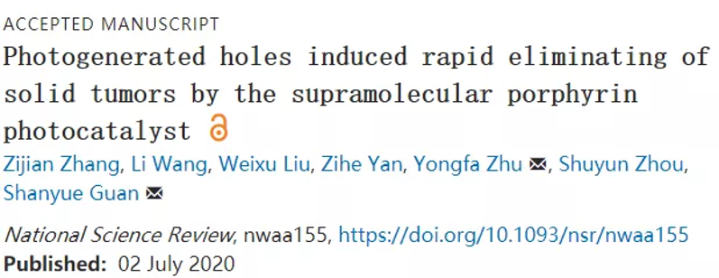 2020年7月2日,清华大学朱永法及中国科学院理化技术研究所Shanyue Guan共同通讯在National Science Review 在线发表题为“Photogenerated holes induced rapid eliminating of solid tumors by the supramolecular porphyrin photocatalyst”的研究论文,该研究建立了一种超分子光催化剂Nano-SA-TCPP,可在600-700 nm波长下进行照射,治疗实体瘤,实体瘤(100 mm3)可以在10分钟内消除。