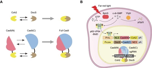 研究团队利用合成生物学的设计原理,将红细菌中响应远红光的蛋白BphS,链球菌中的转录因子BldD以及酿脓链球菌中的Cas9核酸酶经理性设计、组装和重编程,构成了远红光调控的分割型split-Cas9基因编辑系统。其中,Cas9核酸酶被分为N端(第1-713个氨基酸)和C端(第714-1368个氨基酸)两部分,分别融合了来自热纤维梭菌的一对能够自发相互结合的蛋白Coh2和DocS。