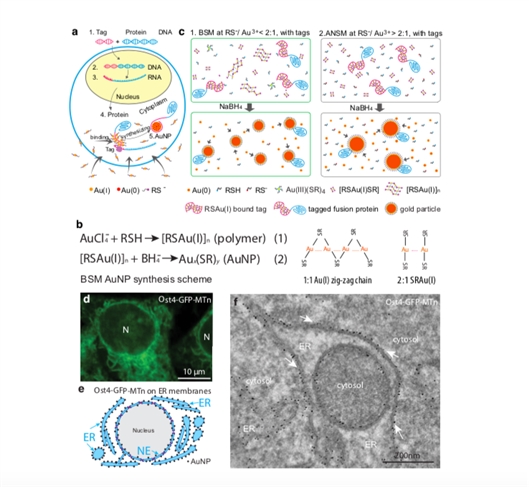 他们首先成功开发了一系列针对纯化的标记蛋白特异性合成2-6 纳米大小的金颗粒技术,并证明纳米金颗粒时在单个标记分子上形成的。利用简单的原核细胞 (大肠杆菌系统)摸索优化出细胞中的标记蛋白上特异性合成纳米金颗粒的实验方案,获得了前所未有超高标记效率。