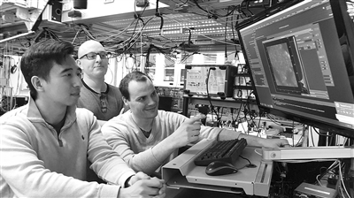 芝加哥大学普利兹克分子工程学院的科学家(从左至右)凯文·苗、克里斯·安德森和亚历山大·鲍拉萨在奥沙洛姆实验室进行量子研究。图片来源:芝加哥大学官网