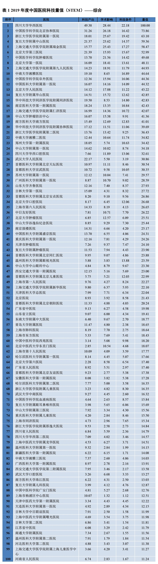 2019年度中国医院STEM发布覆盖了全国1633家医院,涵盖了综合和31个学科前100位医院排名(不包括军队医院)。综合排名前10位的医院分别是四川大学华西医院、中国医学科学院北京协和医院、浙江大学医学院附属第一医院、复旦大学附属中山医院、上海交通大学医学院附属瑞金医院、北京大学第三医院、中国医学科学院肿瘤医院、北京大学第一医院、上海交通大学医学院附属第九人民医院、中南大学湘雅医院。