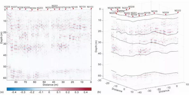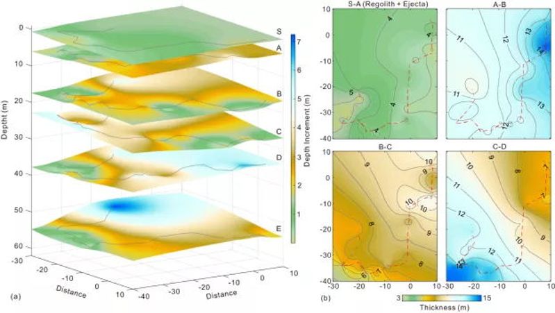 本研究对LPR通道一的浅层数据进行重新处理,在10-40米的深度范围内发现了水平向的连续性强能量反射(图1a),与50多米深的雨海纪顶层反射较为类似。将雷达数据沿测线重新投影,再根据强弱反射可以识别出层状界面(图1b),表明在嫦娥三号着陆区下面应该存在多层爱拉托逊纪火山岩。