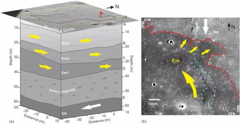 先前研究认为,雨海北部年轻的爱拉托逊纪月海物质(Em)仅仅由一期厚熔岩流形成。近些年,通过摄影测量、陨石坑大小频率分布以及陨石坑穿透深度等方法,发现雨海北部Em厚度变化较大,推测在某些区域可能存在不可见的熔岩流。此外,Robinson等人也发现月海喷发物通常产生一系列10米厚的熔岩流,而不是数十米到数百米厚。前期测月雷达研究中,由于受到通道一数据质量和通道二探测深度的限制,月壤所覆盖的浅层Em结构没有得到很好的约束。
