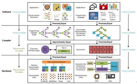 在研究过程中,研究团队针对类脑计算不像通用计算那样注重每个计算过程的精确度,而是更加注重结果拟合的特性,提出了对计算过程和精度约束更低的类脑计算完备性概念,并且设计了相应的类脑计算机层次结构——图灵完备的软件模型、类脑计算完备的硬件体系结构,以及位于两者之间的编译层。通过相关算法,任意图灵可计算函数都可以转换为类脑计算完备硬件上的模型。“这意味着类脑计算系统也可以支持通用计算,极大地扩展了类脑计算系统的应用领域,也使类脑计算软硬件各自独立发展成为可能。”施路平说。
