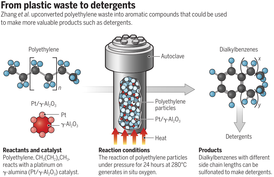 为更好地将塑料中的聚乙烯“变废为宝”,研究人员提出了一种新的串联催化方法,该方法不仅可以直接将废弃塑料中的聚乙烯转变为高价值烷基芳族分子,而且还可以高效、低成本、低能耗地进行。