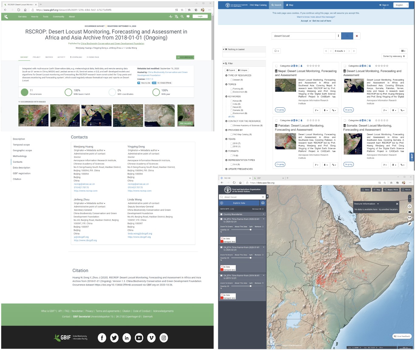 2020年2月至今,该团队针对持续肆虐亚非的沙漠蝗虫,利用中国高分(GF)系列卫星数据、美国Landsat与MODIS数据和欧空局Sentinel系列卫星数据等,结合全球气象数据和调查数据,与虫害预测预报模型相结合,基于数字地球科学平台大数据分析处理,通过具备自主知识产权的植被病虫害遥感监测与预测系统,实现大面积沙漠蝗虫繁殖、迁飞、危害的动态监测预警。该团队现已发布12期亚非沙漠蝗虫灾情监测与评估报告和53组虫害时序动态监测数据集,后续将继续关注沙漠蝗虫灾情进展,并生产和发布虫害服务数据产品与科学报告,持续支撑FAO、GBIF的全球病虫防控和生物多样性保护行动。