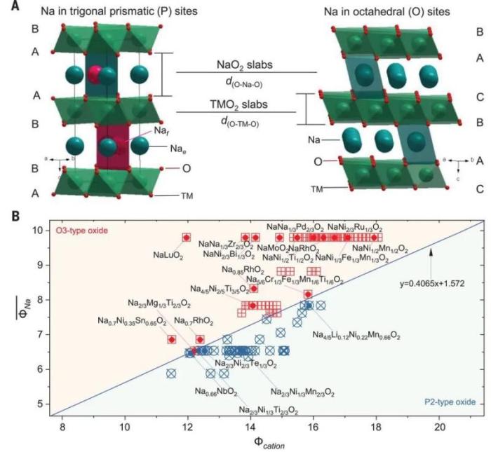 自1980年以来,锂离子层状氧化物(LiMO2)都是锂离子电池的主要正极材料,其堆积构型为O型(Octahedral,八面体)。与之相比,钠离子层状氧化物(NaxMO2)却具有O和P(Prismatic,三棱柱)两种构型,其中最常见的两种结构分别为O3和P2(数字代表氧最少重复单元的堆垛层数)。这两种结构的层状氧化物作为钠离子电池的正极材料时各有优势,但目前的技术手段仅可实现对合成出的材料进行物理表征以确定具体构型,无法直接预测材料的堆积结构,这严重阻碍了层状氧化物正极材料的性能设计和新型正极材料的发现。
