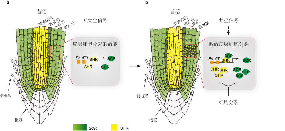 当在豆科植物苜蓿根中过量表达SHR-SCR分子模块时,可以诱导皮层细胞分裂形成根瘤样结构。在非豆科植物拟南芥和水稻根中异位过量表达SHR-SCR分子模块同样可以诱导根皮层细胞分裂,因此SHR-SCR分子模块是植物皮层细胞分裂的充分必要条件,表明豆科植物的皮层细胞获得了SHR-SCR干细胞程序模块可能是豆科植物共生结瘤固氮的前提事件。