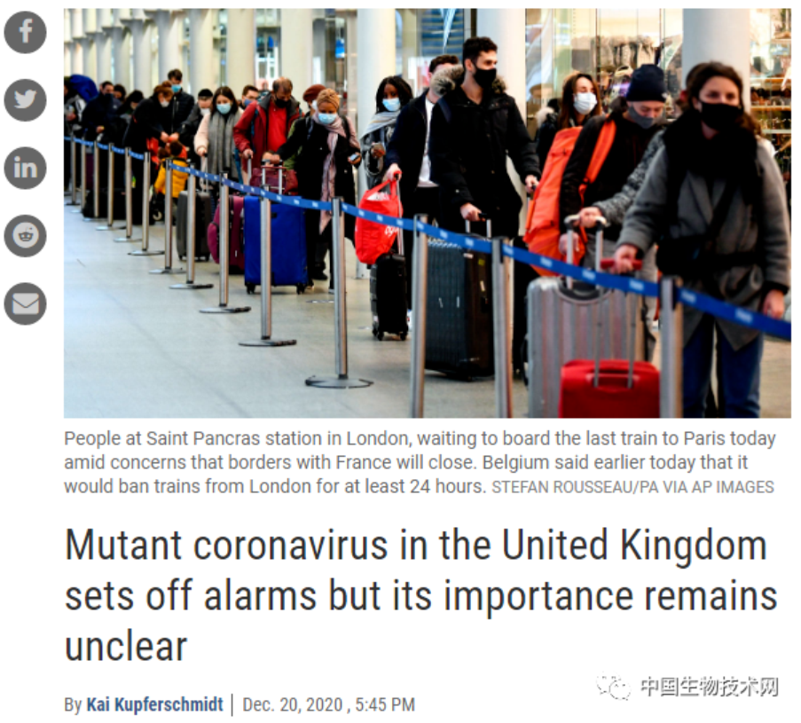 在仅仅不到两周的时间,这种变异株就给英国和欧洲其他国家造成了混乱。这种名为B.1.1.7的变异株似乎更容易在人与人之间传播。这一消息导致许多伦敦人在新规定生效前逃离了这座城市,导致火车站拥挤不堪。在同一天,荷兰、比利时和意大利宣布暂停了来自英国的客运航班。从布鲁塞尔到英国首都的欧洲之星列车将在今晚(当地时间20日晚)午夜停止运营至少24小时。