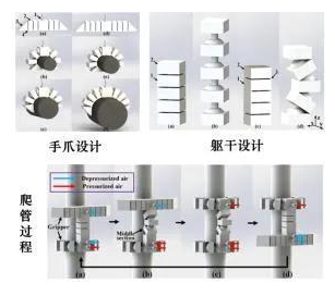 此外,课题组还提出了一种新型气动管道爬行机器人,可应用于工业管道设施的检查和实时监控。该管道爬行机器人采用仿生尺蠖原理,通过巧妙布置薄膜气缸单元之间的连接,实现机器人在管道内、外壁面爬行。