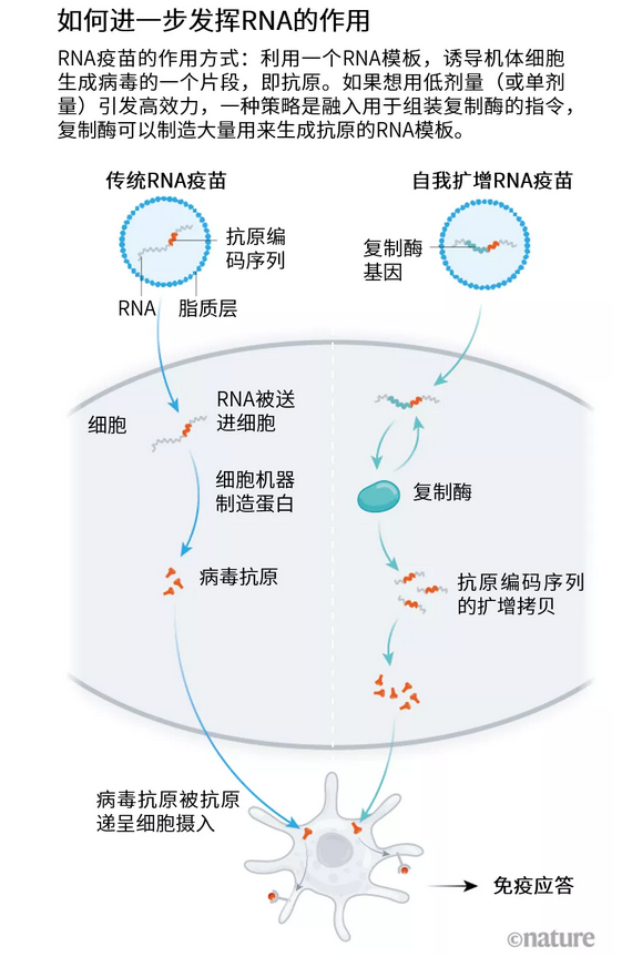 这样的疫苗构造有点“笨重”,需要更多的序列优化和生产技巧。但是,它可以让疫苗公司降低剂量。复制的RNA可以更好地模仿自然病毒感染过程——触发更强、更广谱的免疫应答,这或许能支持单剂量接种方案。