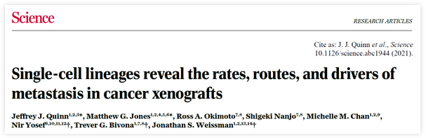 2021年1月21日,麻省理工学院(MIT)、加州大学伯克利分校和加州大学旧金山分校的研究人员在国际顶尖学术期刊 Science 杂志发表了题为:Single-cell lineages reveal the rates, routes, and drivers of metastasis in cancer xenografts(单细胞谱系揭示癌症异种移植的转移率、途径和驱动因素)的研究论文。