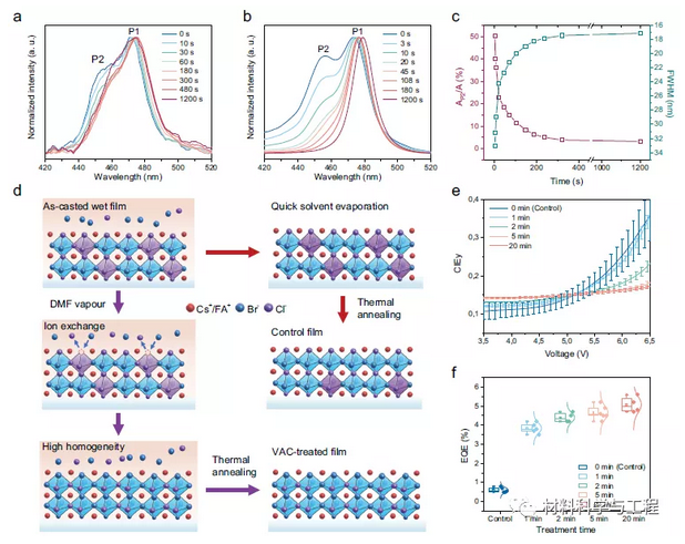 图3了解VAC过程中卤化物的重新分布。a,b保持在手套箱气氛(a)和DMF气氛(b)中的前体膜的PL随时间变化。cVAC处理薄膜中发射线宽的变化以及P2(AP2)在发射带(A)各自总面积中的比例随时间变化。d提出的卤化物再分配机制的示意图。此处,紫色Pb(Br/Cl)64-八面体表示相对于化学计量的溴化物/氯化物分布(蓝色八面体)而言富含氯化物的相。卡其色代表薄膜中的液相,蓝色箭头代表离子交换过程。为了清楚起见,未示出干燥膜内的过量离子。e,f CIE的演变是根据VAC处理持续时间(0、1、2、5、20分钟)的变化(e)和设备的峰值EQE来协调的。f误差线表示从4到6个设备中提取的标准偏差。