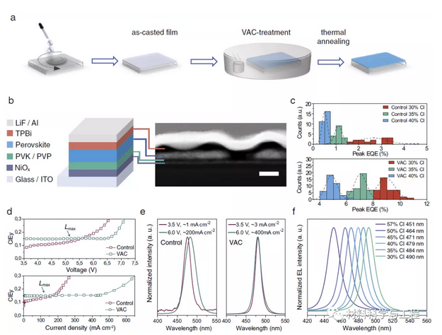 图1器件制造和特性。a VAC处理的示意图。b PeLED结构示意图和HAADF横截面器件图。比例尺为100 nm。c从氯化物含量(30%,35%和40%)变化的对照(顶部)和经过VAC处理的设备(底部)中提取的峰值EQE的直方图。d–fCl含量为40%的对照和VAC处理设备的光谱稳定性。CIEy与施加电压(d上图)和电流密度(d下图)的代表图;用于控制(e左图)和经过VAC处理的设备(e右图)在低和高电压/电流密度下的EL光谱;在最大亮度(f)下,氯化物含量(30-57%)变化的VAC处理过的设备的EL光谱。在(d)中标记为Lmax的点代表峰值亮度的操作条件。