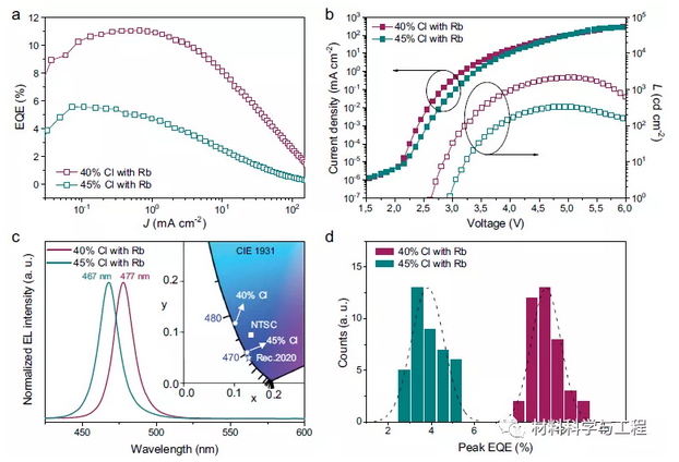 图4 Cl含量为40%和45%的Rb钝化钙钛矿的器件性能。a EQE电流密度(J)曲线(J-EQE)。b电流密度-电压-亮度(J–V–L)特性。c EL光谱和CIE颜色坐标。CIE 1931(x,y)色度图中的正方形和五角星形分别表示美国国家电视系统委员会(NTSC)和建议bt.2020(Rec.2020)中指定的原蓝色的颜色坐标。d每种情况下从40个设备中提取的峰值EQE的直方图。