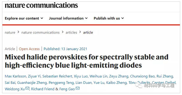 来自瑞典林雪平大学的高峰课题组解决了混合卤化物钙钛矿中的这些关键挑战,并演示了在490至451 nm的宽发射波长范围内光谱稳定的蓝光钙钛矿LED。通过改变卤化物组成直接调节发射颜色。特别是,基于三维钙钛矿的蓝色和深蓝色LED分别取得11.0%和5.5%的EQE值,发射峰分别位于477和467 nm。这些结果是通过蒸气辅助结晶技术实现的,该技术大大减轻了局部成分的异质性和离子迁移。相关论文以题为“Mixed halide perovskites for spectrally stable and high-efficiency bluelight-emitting diodes”发表在Nature Communications。