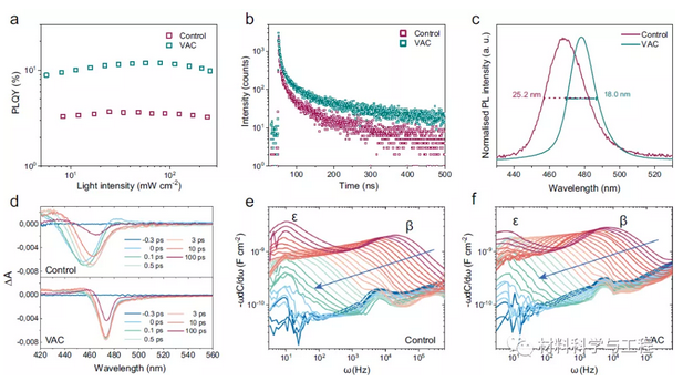 图2了解VAC处理设备的出色光谱稳定性。a-d对照和真空处理钙钛矿薄膜的光物理表征:荧光依赖性PLQYs (a);通过TCSPC(b)测量的PL衰减。PL光谱(c);在400 nm激发后,对照膜(顶部)和VAC处理的膜(底部)的瞬态吸收(d)。e,f用于对照(e)和经过VAC处理(f)的器件的温度相关电容与频率关系图的导数。蓝色箭头指示温度从350 K变为200 K。在这里,可以看到两个标记为β和ε的移动离子。