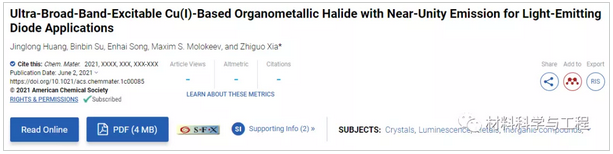 在此,华南理工大学的夏志国教授课题组制备了一种零维Cu(I)基有机金属卤化物(18-crown-6)2Na2(H2O)3Cu4I6(CNCI),其绿光发射带以536 nm为中心,在450 nm激发时PLQY接近100%。重要的是,在CNCI中观察到了覆盖300-500 nm范围的超宽激发带,并详细讨论了发光机制。制造了具有156 lm/W的高发光效率和89.6的高显色指数的白光发光二极管(WLEDs)。该工作为设计具有合适激发特性的高性能发光金属卤化物提供了指导,也促进了此类材料在WLEDs领域的应用前景。相关论文以题为“Ultra-Broad-Band-Excitable Cu(I)-Based Organometallic Halide with Near-Unity Emission for Light-Emitting Diode Applications”发表在Chem. Mater.期刊上。