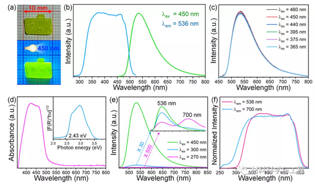 图 2. (a) 在日光(上)和450 nm蓝光(下)下生长的CNCI单晶的光学照片。(b) CNCI晶体在室温下的PL(λex = 450 nm)和PLE(λem = 536 nm)光谱。(c) CNCI晶体在室温下的激发波长相关PL光谱。(d) CNCI晶体的吸收光谱;插图显示了CNCI晶体的漫反射光谱。CNCI晶体的激发(e)和发射(f)波长相关的PL和PLE光谱。