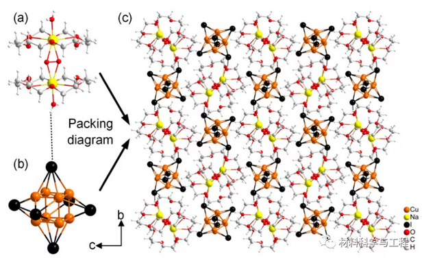图 1. (a)(18-crown-6)2Na2(H2O)32+离子的详细视图。每个Na离子由一个18-crown-6有机配体和两个放置在两极的H2O分子配位形成一个块。两个这样的块通过H2O桥分子相互连接,该分子在两个位点上是无序的。无序的H2O分子被描绘成没有H原子,因为它们不是局部的。(b)Cu4I62−多面体单元的详细视图。四个Cu+离子在结构中的八个位点上是无序的;因此,它们仅以50%的概率占据站点。(c) (18-crown-6)2Na2(H2O)3Cu4I6的晶体结构沿a轴观察以显示具有孤立Cu4I62−单元的0D特征。