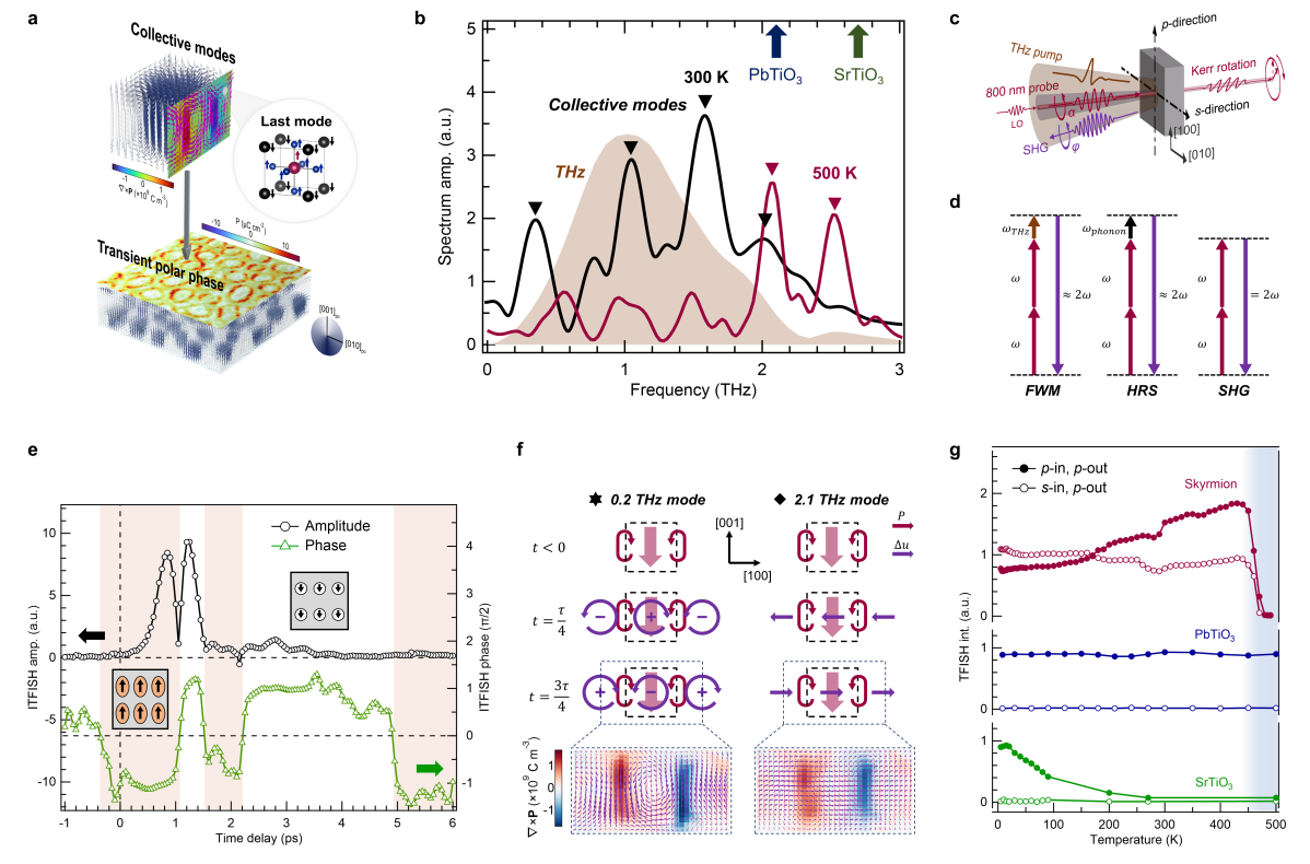 图 太赫兹脉冲激发下斯格明子的集体动力学模式与瞬态极性相。(a)通过太赫兹谐振激发集体振荡模式诱导瞬态极性相示意图;(b)斯格明子集体振荡模式的动力学相场模拟结果;(c)测试装置示意图;(d)瞬态二次谐波响应的理论模型;(e)干涉式太赫兹场致二次谐波(iTFISH)测量结果;(f)集体振荡模式的空间运动模式模拟结果;(g)斯格明子太赫兹动力学的温度稳定性