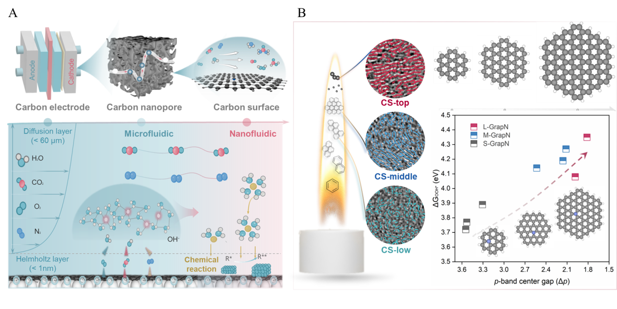 图 碳基电催化能质传递与转化机制研究。(A)碳基电催化界面多尺度传质路径;(B)纳米碳sp2晶畴尺寸与局域活性位点耦合效应