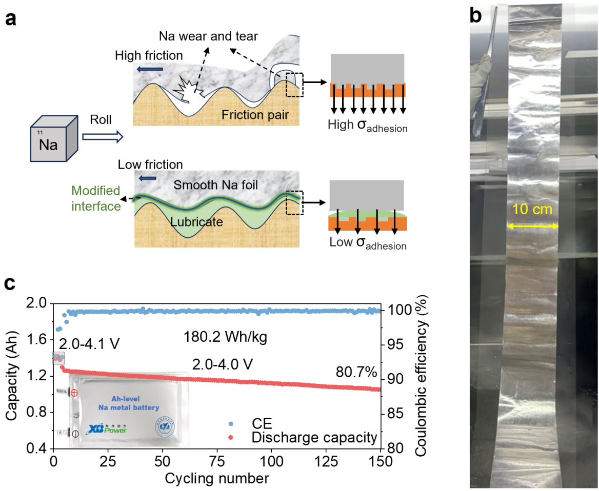 图 超薄钠金属箔的制备及其在钠金属电池中的应用:(a)超薄钠箔轧制过程示意图;(b)米级、50 μm钠箔的实物照片;(c)钠金属软包电池的循环性能及实物照片