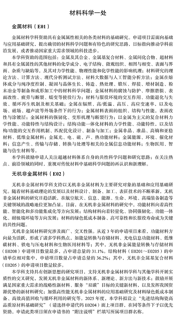 首页  >>  项目指南  >>  2025年项目指南  >>  科学部资助领域和注意事项  >>  工程与材料科学部