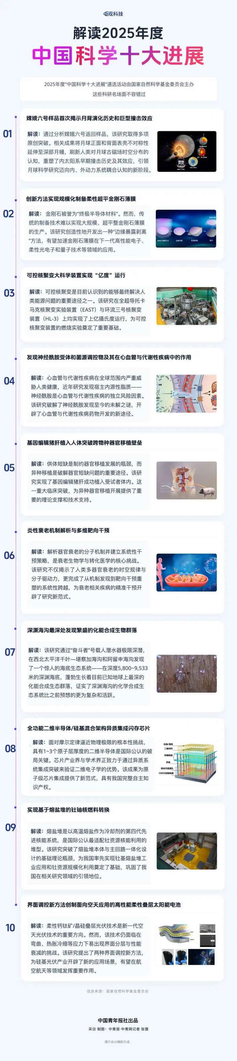 中国青年报客户端北京3月25日电(中青报·中青网记者 张茜)2026年3月25日,国家自然科学基金委员会党组书记、主任窦贤康在2026中关村论坛年会开幕式上发布了2025年度“中国科学十大进展”。它们分别是:嫦娥六号样品首次揭示月背演化历史和巨型撞击效应、创新方法实现规模化制备柔性超平金刚石薄膜、可控核聚变大科学装置实现“亿度”运行、发现神经酰胺受体和菌源调控物及其在心血管与代谢性疾病中的作用、基因编辑猪肝植入人体突破跨物种器官移植壁垒、炎性衰老机制解析与多维靶向干预、深渊海沟最深处发现繁盛的化能合成生物群落、全功能二维半导体/硅基混合架构异质集成闪存芯片、实现基于熔盐堆的钍铀核燃料转换、界面调控新方法创制面向空天应用的高性能柔性叠层太阳能电池。