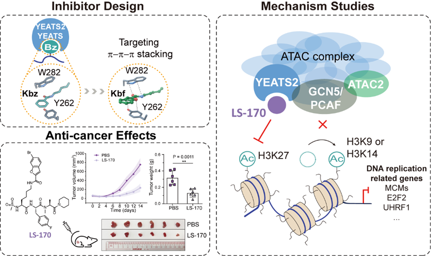 在NSCLC等肿瘤中,ATAC特有的非HAT亚基YEATS2频繁扩增且高表达,并与不良预后显著相关。研究团队将YEATS2作为化学干预靶点,通过基于结构的抑制剂设计和多轮药物化学优化,获得具有高亲和力和细胞通透性的YEATS2抑制剂LS-170,可在细胞内特异性作用于ATAC复合物而不影响SAGA。研究表明,LS-170通过阻断YEATS2与染色结合,下调与DNA复制和细胞周期相关基因的表达,抑制肿瘤细胞增殖、迁移和侵袭。在非小细胞肺癌小鼠模型中,尾静脉注射LS-170显著抑制肿瘤生长,且未引起明显毒性。
